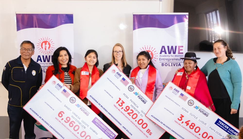 La Academia para Mujeres Emprendedoras (AWE Bolivia) es una iniciativa de la Embajada de Estados Unidos en Bolivia, ejecutada por la Fundación Emprender Futuro, que desde su creación ha beneficiado a más de 800 mujeres en los nueve departamentos del país, transformándose en un programa clave que impulsa el fortalecimiento económico de las mujeres.